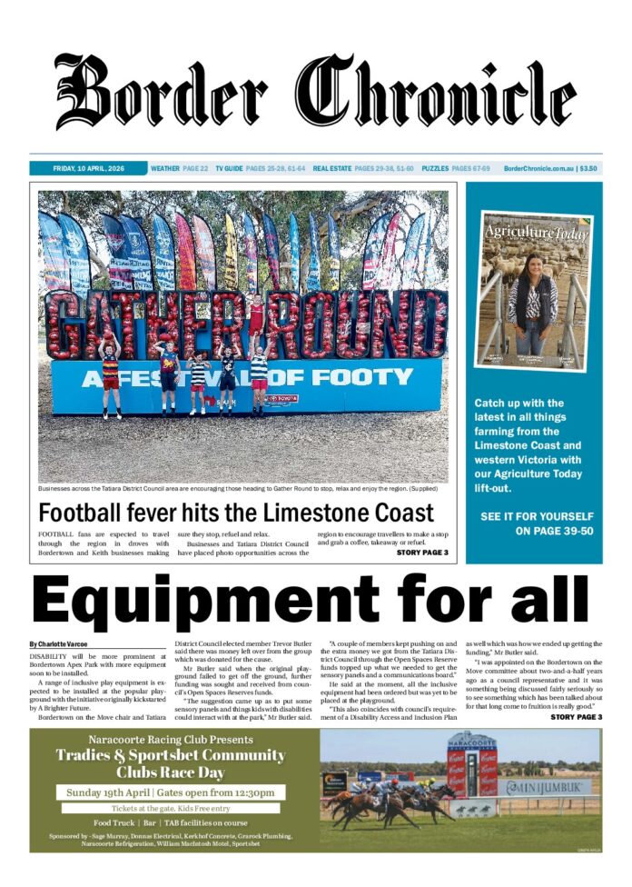 Border Chronicle – 10th April 2026 Subscribe or Login to see the rest of the content. Username Password * Remember Me Forgot Password News Warwar lit up after upgrade 12/04/2026 A TOTAL of 91 solar lights around the Blue Lake/Warwar have been replaced in recent weeks. The upgrade has restored full lighting to the popular... Casterton delivers at the Drags 12/04/2026 CASTERTON’s Street Drags proved successful for another year, with a huge crowd flocking to Sandford Flat to see the race and burnout action. This year’s... Limestone Coast Cup 2026 12/04/2026 THE DOC team had a huge weekend at the Axis Employment Limestone Cup 2026 held in Mount Gambier/Berrin over the weekend. The Victorian team...