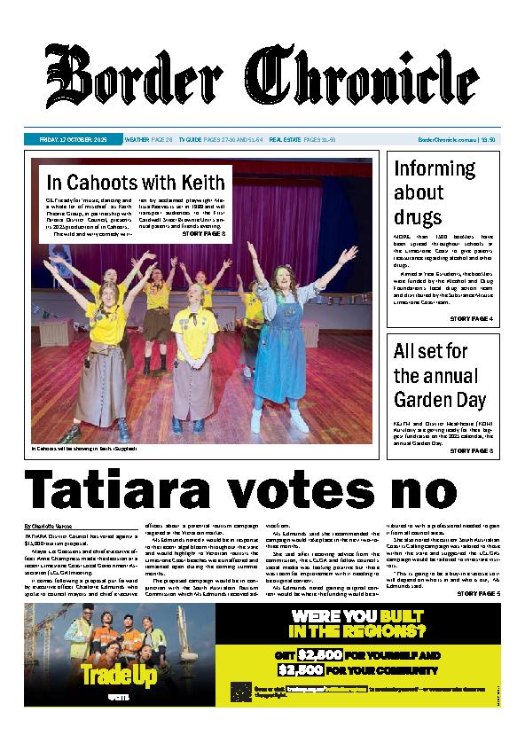 Border Chronicle – 17th October 2025 Subscribe or Login to see the rest of the content. Username Password * Remember Me Forgot Password News Fishing competition called off in city 30/10/2025 Mount Gambier/Berrin fishers have missed out on a the chance to take part in a statewide fishing competition. RecFish SA recently launched Let's Go... Last chance to enter 30/10/2025 If you have a knack for knitting, or a baking bug, make sure to get your entries in for the Millicent Show. But be... Showtime fun comes to Millicent 30/10/2025 The Millicent Show is just around the corner and the finishing touches are being completed. The committee has been working tirelessly to put on...