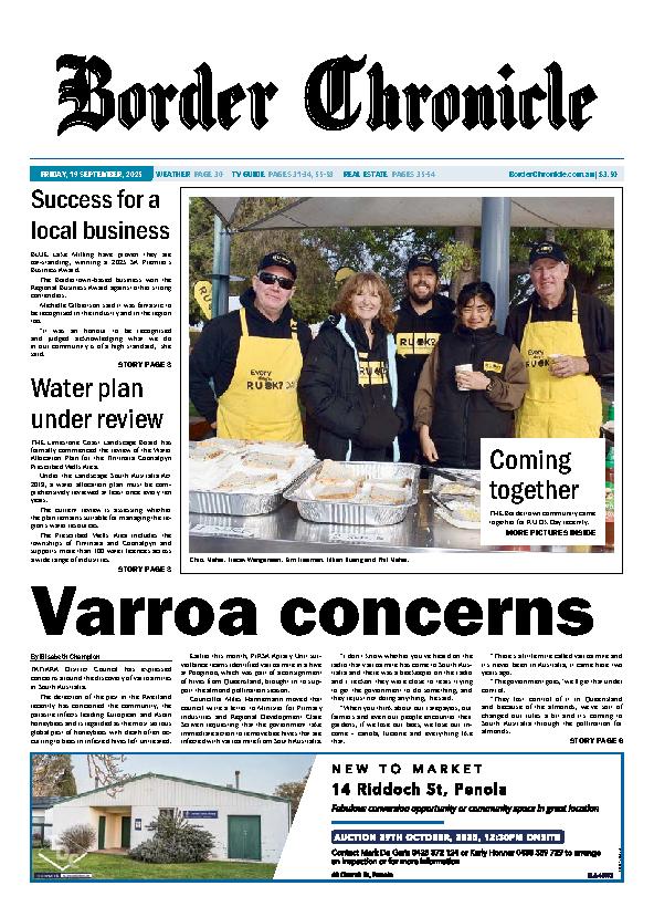 Border Chronicle – 19th September 2025 Subscribe or Login to see the rest of the content. Username Password * Remember Me Forgot Password News Saints rise in tight contest 07/10/2025 MILLICENT 6.3 (39) d NORTH GAMBIER 5.5 (35) MILLICENT made a statement in Round 2 of Limestone Coast women’s football on Friday night. The Saints met... Captain signs on the dotted line 07/10/2025 THE Castec Rural Pioneers have announced the first official signing for the men's team ahead of the 2026 NBL1 South season. Captain Kane... The gift that keeps on giving 07/10/2025 GIVEN her father Paul Herry’s long involvement with greyhounds, April Janssen had grown up with the breed. But it had not been until 2023...