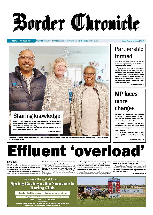 Border Chronicle – 24th October 2025 Subscribe or Login to see the rest of the content. Username Password * Remember Me Forgot Password News Fishing competition called off in city 30/10/2025 Mount Gambier/Berrin fishers have missed out on a the chance to take part in a statewide fishing competition. RecFish SA recently launched Let's Go... Last chance to enter 30/10/2025 If you have a knack for knitting, or a baking bug, make sure to get your entries in for the Millicent Show. But be... Showtime fun comes to Millicent 30/10/2025 The Millicent Show is just around the corner and the finishing touches are being completed. The committee has been working tirelessly to put on...