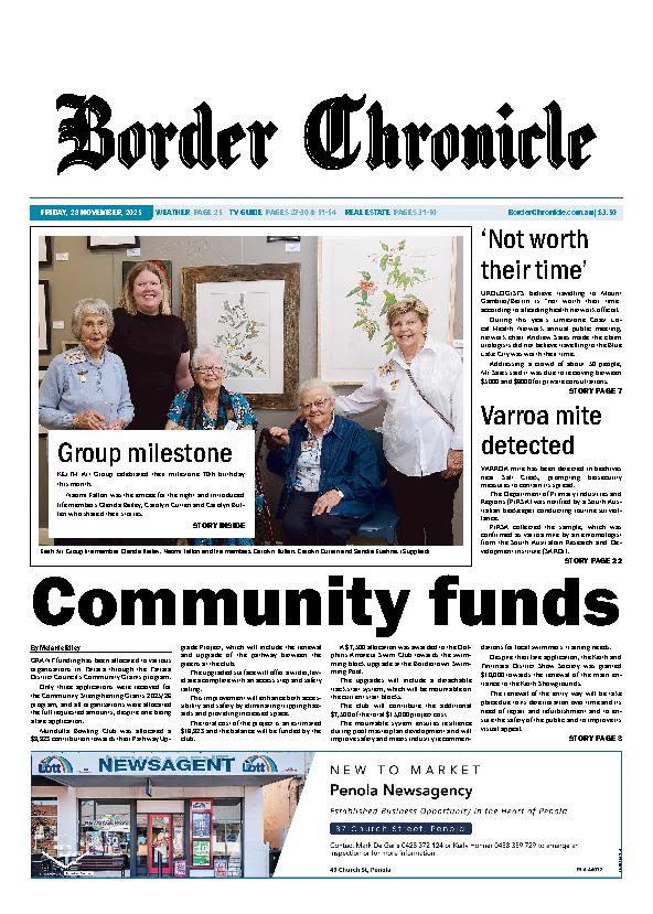 Border Chronicle – 28th November 2025 Subscribe or Login to see the rest of the content. Username Password * Remember Me Forgot Password News Mixed results for Penola bowlers 02/12/2025 LAST the Penola Bowls Club's Friday Ladies Division 1 side lost to Port MacDonnell Blue by 11 shots 38-49 and Division 2 won over... Impressive effort from Shawcross 02/12/2025 KAREN Shawcross claimed Serviceton Bowling Club Ladies Singles Championship for the 2025/26 bowling season. The preliminary rounds were played Saturday morning, with all games close,... Penola secures first win 02/12/2025 PENOLA Rangers have found their first win of the Southern Ports Tennis season, defatting the Beachport Buccaneers on Saturday. In what was a tight...