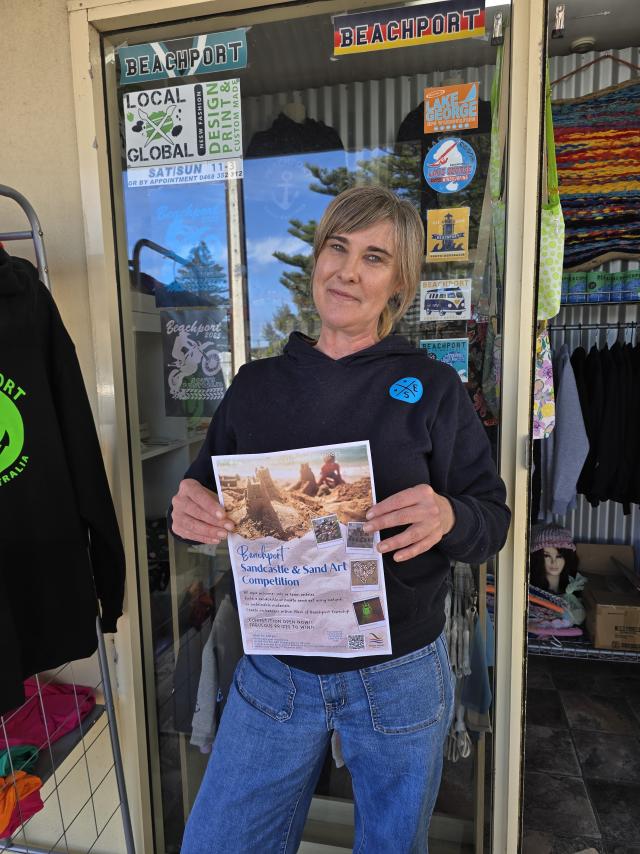 Beachport Tourism Working Group member, Leah Hamilton with the posters for the Beachport Sand Art and Sandcastle Competition. (Supplied)