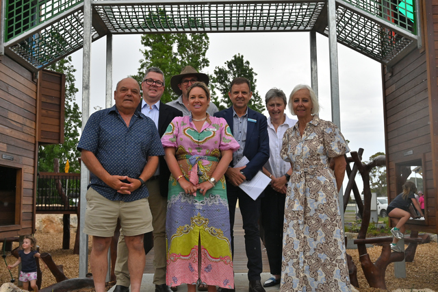Volunteer Rocky, Assistant Minister for Artificial Intelligence (AI), Digital Economy, Defence and Space Industries Michael Brown, landscaper Andrew Bear, Keith War Memorial Community Centre vice chair and playground redevelopment sub-committee leader Sarah Secker, Member for Mackillop Nick McBride, Tatiara District Council Mayor Liz Goossens and Keith War Memorial Community Centre chairperson Anna Young in front of the new Don Moseley Park playground in Keith.