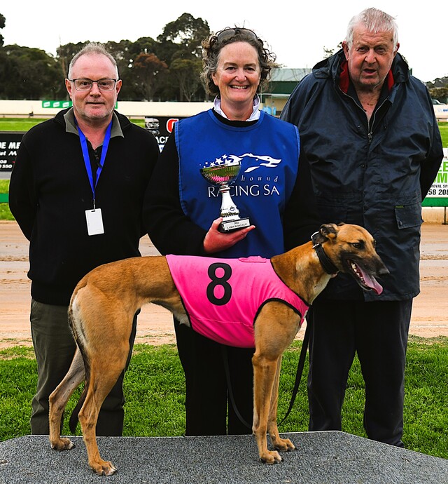 Mount Gambier Greyhound Racing Club manager Tim Lewi and MGGRC committee member Michael Robinson with owner-trainer April Janssen and Swift Gift at the Labour Day Cup presentation. (Supplied)