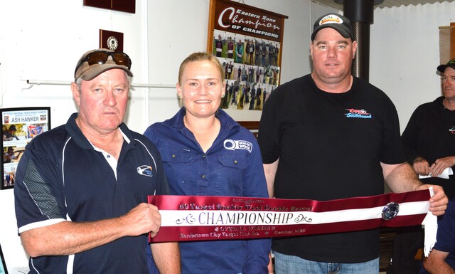 Wayne and Brock Hawker shared the Overall and AA grade honours in the 40-target Double Barrel Championship. They are pictured with Kelsie Turner representing the event sponsor, Quality Wool, Bordertown. (Supplied)